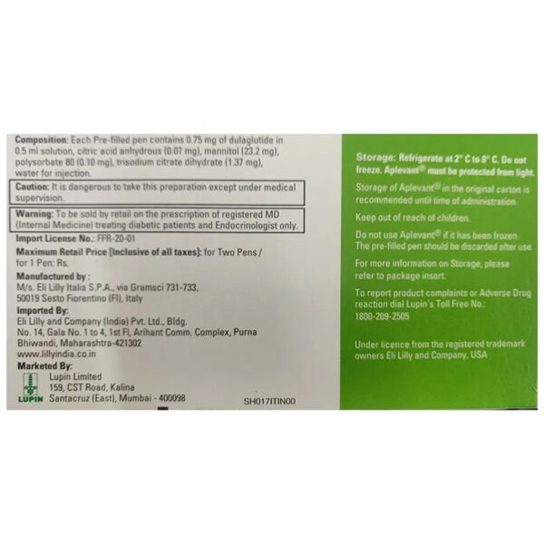 Aplevant 0.75mg Pre-filled Pen is an anti-diabetic medication. It works by increasing the release of insulin from the pancreas, decreases hormones that raise blood sugar levels, slows down digestion, and reduces appetite.