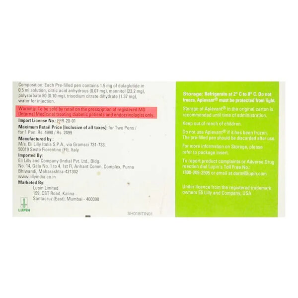 CONSULT YOUR DOCTOR – Aplevant 1.5mg Pre-filled Pen (0.5ml Each) may be unsafe to use during pregnancy. Although there are limited studies in humans, animal studies have shown harmful effects on the developing baby. Your doctor will weigh the benefits and any potential risks before prescribing it to you. Please consult your doctor.