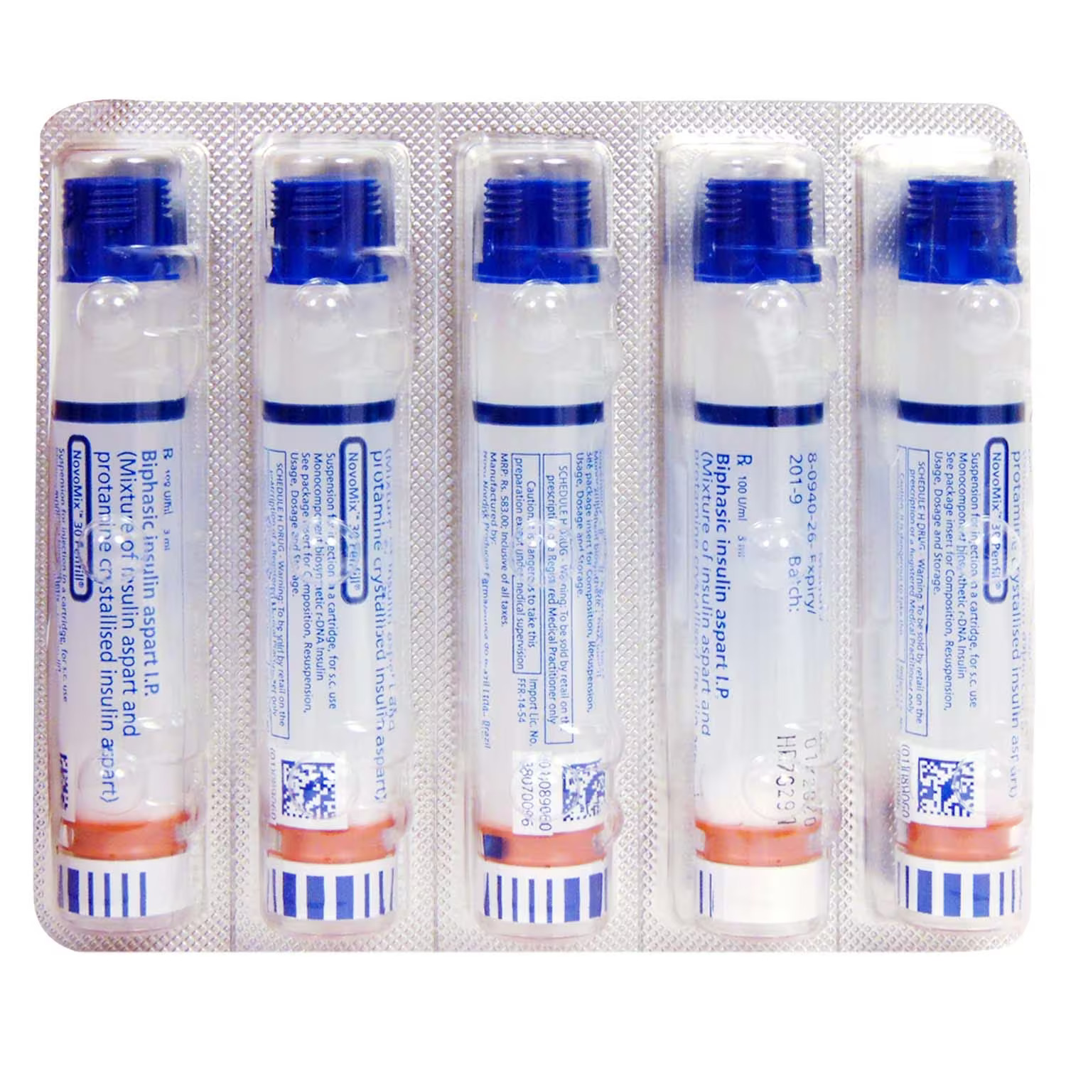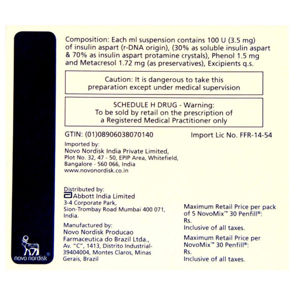Novomix 30 100IU/ml Penfill 5 x 3 ml works by ensuring rapid and stable sugar control. Novomix 30 100IU/ml Penfill 5 x 3 ml is combination of fast-acting and intermediate acting insulin that helps lower blood sugar levels after the intake of food. Prevents the risk of having severe complications of diabetes. It stimulates the recovery of sugar in muscle and fat cells and thus suppresses the production of sugar in the liver. Novomix 30 100IU/ml Penfill 5 x 3 ml helps in improving the glycaemic control which in turn decreases the risk of progression of complications of diabetes like damage of retina (retinopathy), damage of kidney (nephropathy), damage of nerve cells (neuropathy), delayed wound healing, diabetic foot ulcer and others.