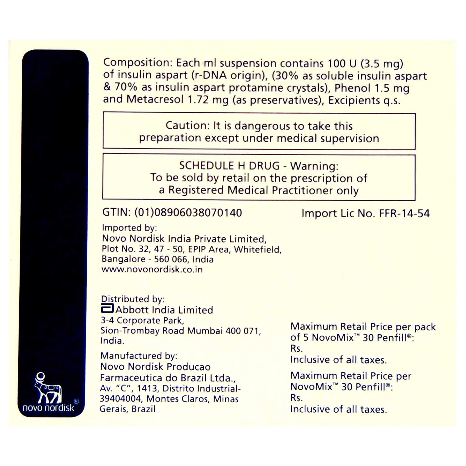 Take Novomix 30 100IU/ml Penfill 5 x 3 ml as prescribed by your doctor. You are advised to take Novomix 30 100IU/ml Penfill 5 x 3 ml for as long as your doctor has prescribed it for you, depending on your medical conditions. You may experience weight gain, injection site allergic reaction, rash, lipodystrophy (skin thickening or pits at the injection site), hypoglycaemia (low blood glucose level), and itching. Most of these side effects of Novomix 30 100IU/ml Penfill 5 x 3 ml do not require medical attention and gradually resolve over time. However, if the side effects are persistent, reach out to your doctor.