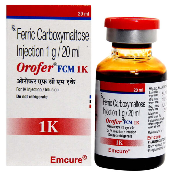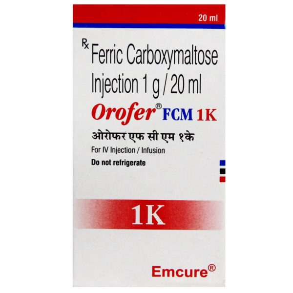 Orofer FCM 1K Injection 20 ml belongs to the group of anti-anaemic medicines used to treat iron deficiency anaemia in patients who are intolerant to oral iron preparations, have non-dialysis dependant chronic kidney disease, or require a quick build-up of iron stores. Iron deficiency anaemia (lack of red blood cells caused by too little iron in the body) is a condition in which the body does not have enough red blood cells for carrying adequate oxygen to various body tissues. Orofer FCM 1K Injection 20 ml contains ‘ferric carboxymaltose’, which acts as a source of iron and helps in the transportation of oxygen throughout the body and the production of red blood cells. Thereby, Orofer FCM 1K Injection 20 ml helps in treating anaemia. Orofer FCM 1K Injection 20 ml helps various vital processes in the body. Orofer FCM 1K Injection 20 ml will be administered by a healthcare professional; do not self-administer. In some cases, you may experience certain common side effects such as nausea, flushing, dizziness, high blood pressure, and low levels of phosphorus in the blood. Most of these side effects do not require medical attention and will resolve gradually over time. However, you are advised to talk to your doctor if you experience these side effects persistently. Let your doctor know if you are taking any prescription, non-prescription drugs, or herbal products before starting Orofer FCM 1K Injection 20 ml. If you are known to be allergic to any of the components in Orofer FCM 1K Injection 20 ml, please inform your doctor. Consult a doctor before taking Orofer FCM 1K Injection 20 ml if you are pregnant or breastfeeding. Orofer FCM 1K Injection 20 ml is not recommended for children below 14 years as safety and effectiveness have not been established.
