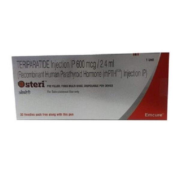 Osteri 600Mcg/2.4Ml Inj belongs to the class of medication called ‘anabolic (promoting bone formation) agent’ indicated for prevention and treatment of osteoporosis in adults and helps to strengthen the bone. This medicine also helps to reduce the risk of spine and hip fractures. Osteoporosis is a medical condition in which bone becomes thin or weak. The chance of developing osteoporosis increases with age, after menopause or by taking corticosteroid medications (such as prednisone) for a long period. If proper treatment is not provided then it can even result in broken bones.