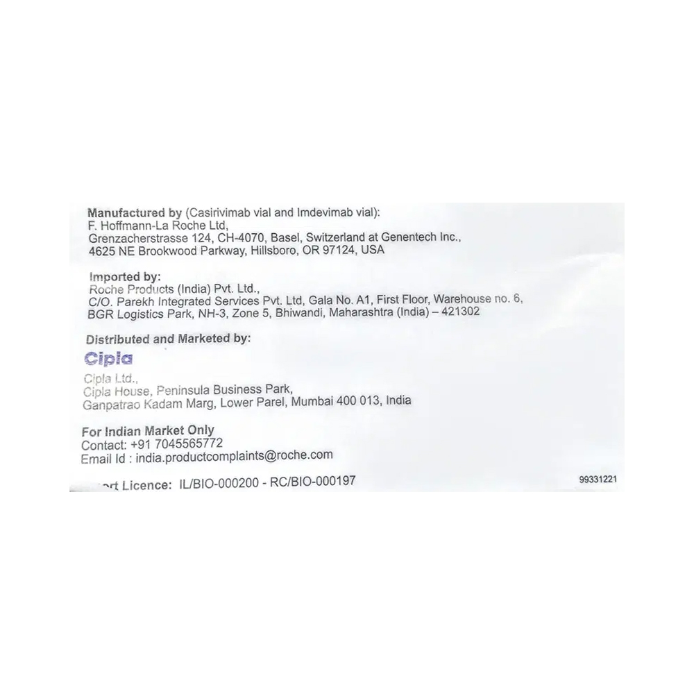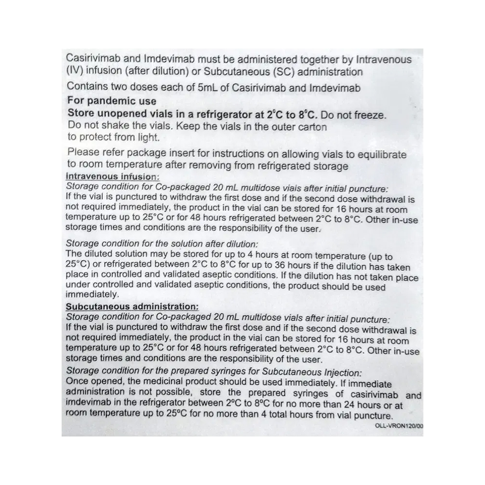 Ronapreve 120mg Injection Combi Pack should be given either into a vein (intravenously) or below the skin (subcutaneously) by a trained healthcare professional, preferably in a hospital setup. This is because the use of monoclonal antibodies may cause some side effects that may need immediate medical attention, such as severe allergic reactions (anaphylaxis). Patients should be monitored during and at least 1 hour after the injection.