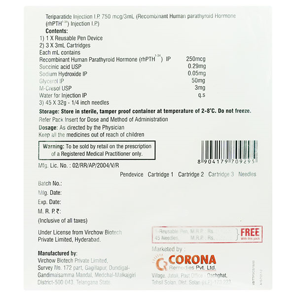 CONSULT YOUR DOCTOR – Tricium PTH TP3 250mcg Injection may be unsafe to use during pregnancy. Although there are limited studies in humans, animal studies have shown harmful effects on the developing baby. Your doctor will weigh the benefits and any potential risks before prescribing it to you. Please consult your doctor.