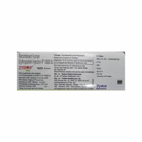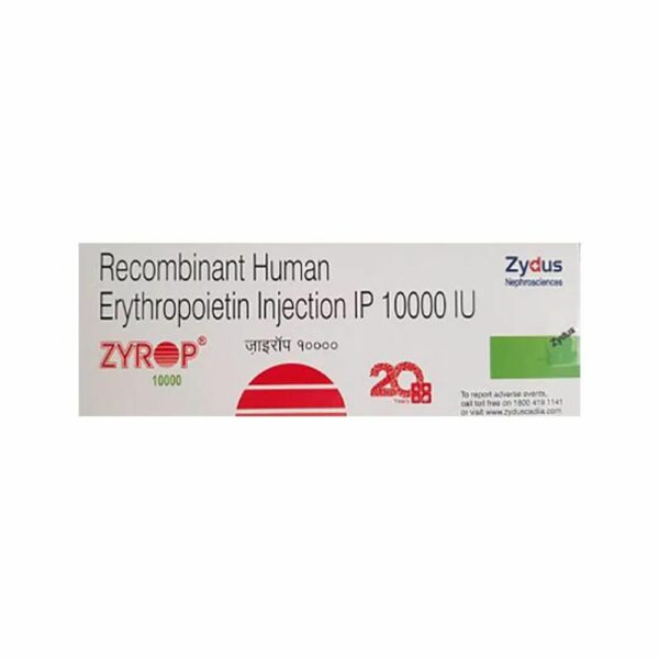 Zyrop 10000 Injection is a medicine that helps your bone marrow to produce more red blood cells. It is used to treat a type of anemia caused by kidney disease. It is also used to treat anemia caused by cancer chemotherapy and by taking medicines to treat HIV.